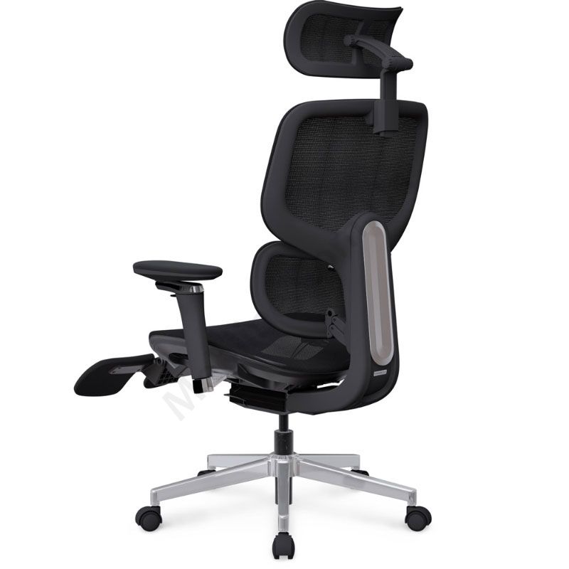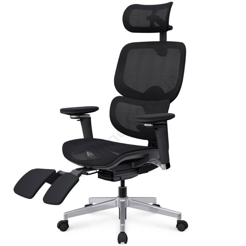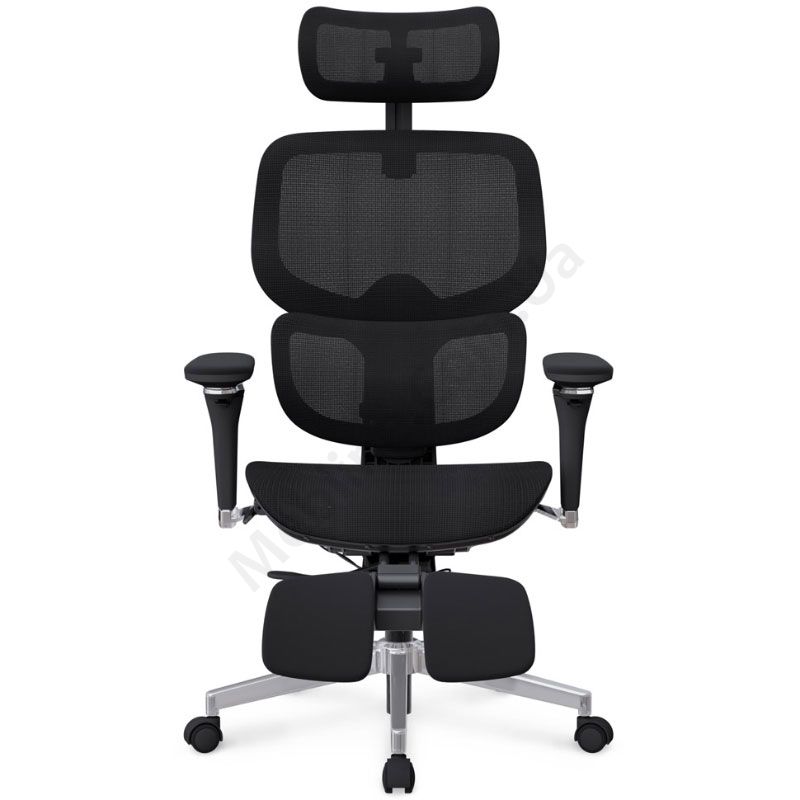 Крісло чорного кольору з підставкою для ніг, регулюванням підлокітників та підголовника.