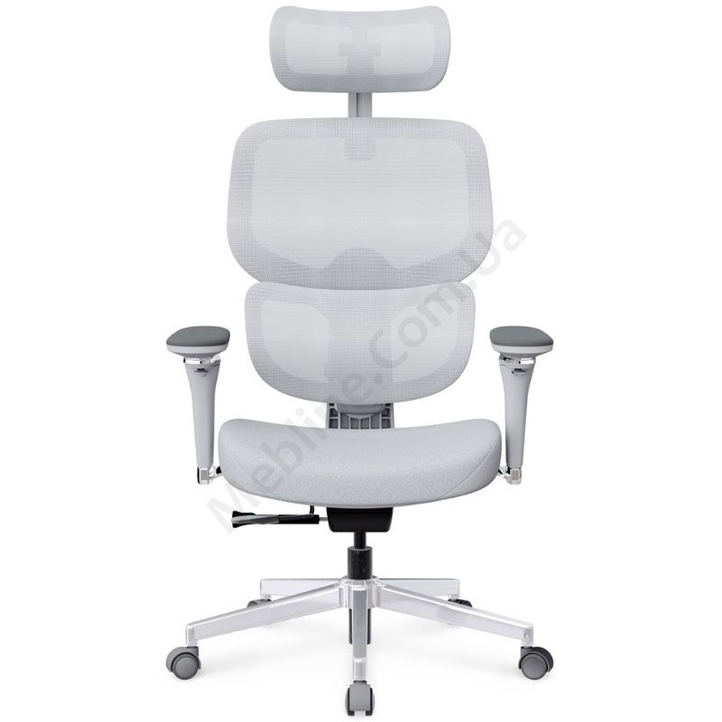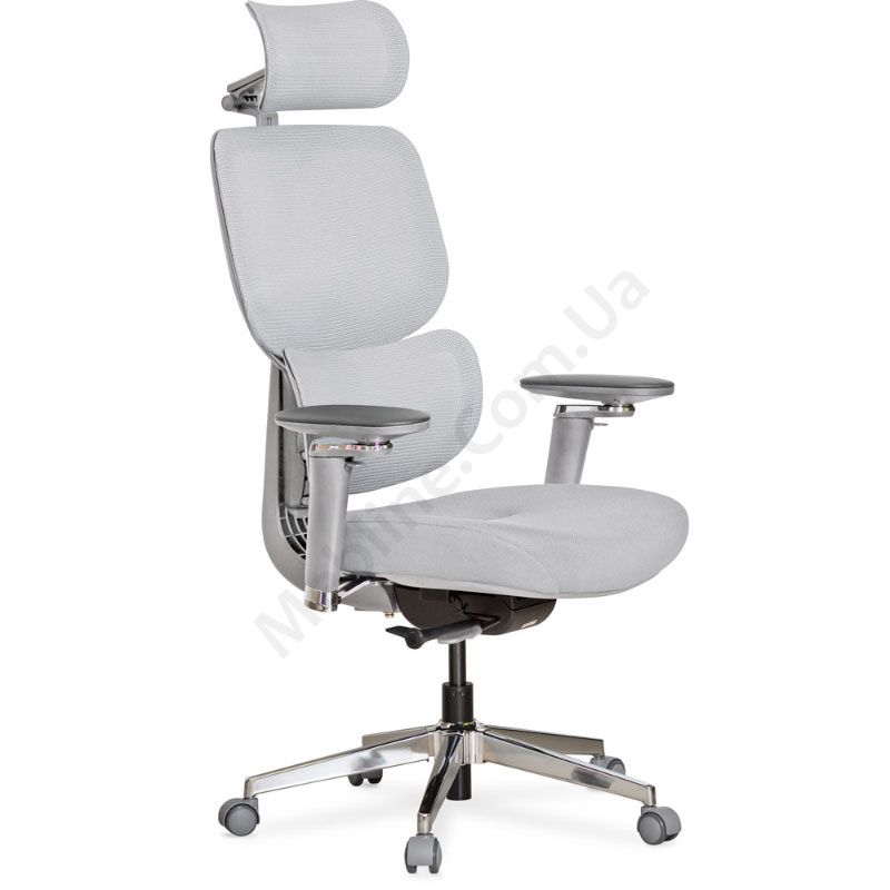 Крісло сірого кольору з синхромеханізмом, регулюванням підлокітників та підголовника.