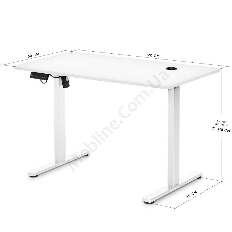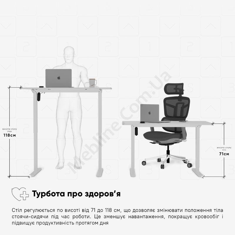 - Стіл регулюється за висотою, що дає змогу працювати сидячи та стоячи.