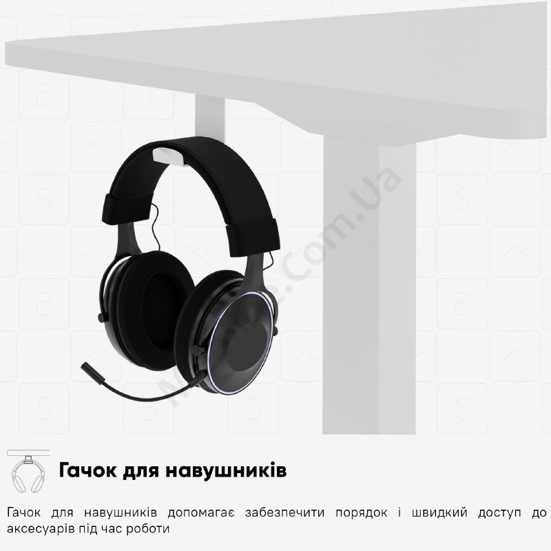- Гачок для навушників та інших аксесуарів дозволяє звільнити простір на стільниці.