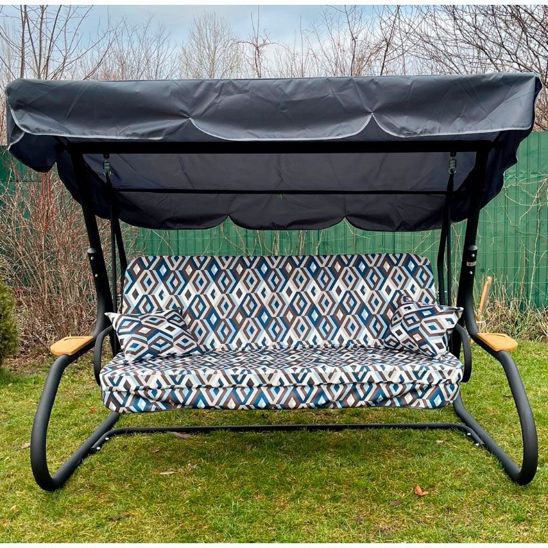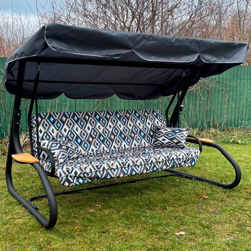 Садова гойдалка з відкидною спинкою на чорному каркасі.