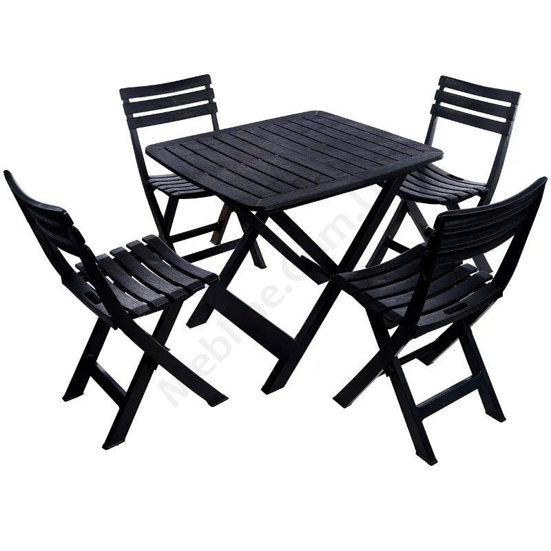 Набір складаних пластикових меблів антрацитового кольору зі столом та чотирма стільцями.