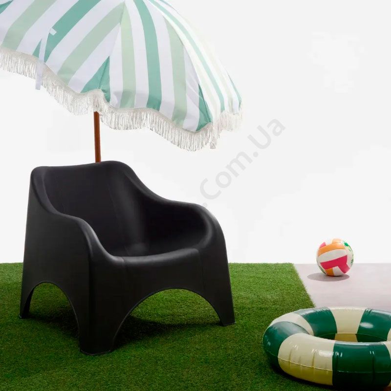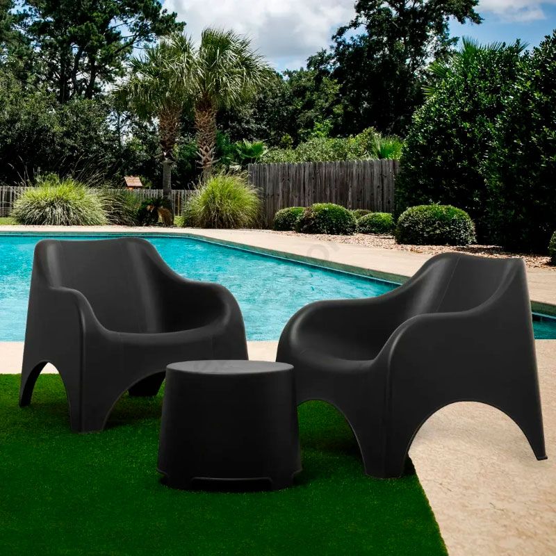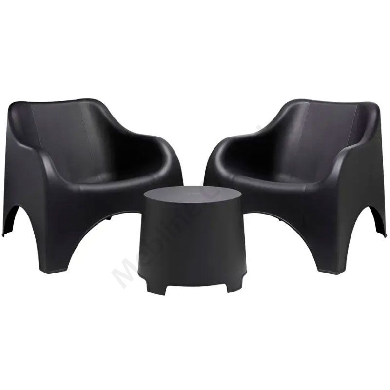 Набір антрацитових пластикових меблів округлої форми зі столом та двома стільцями.