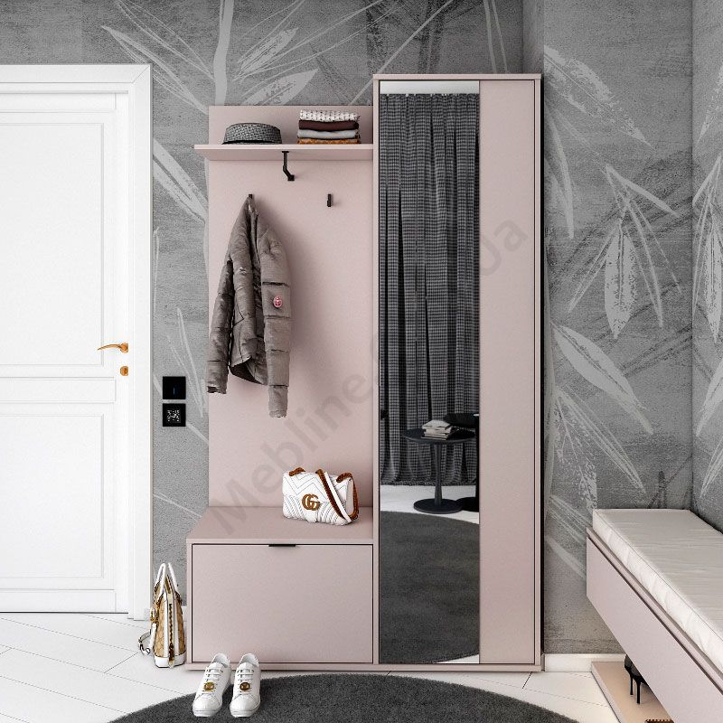 Передпокій з шафою, дзеркалом та тумбою для взуття.