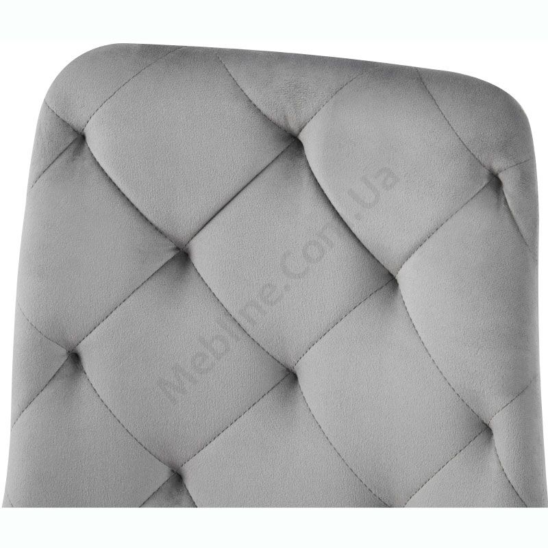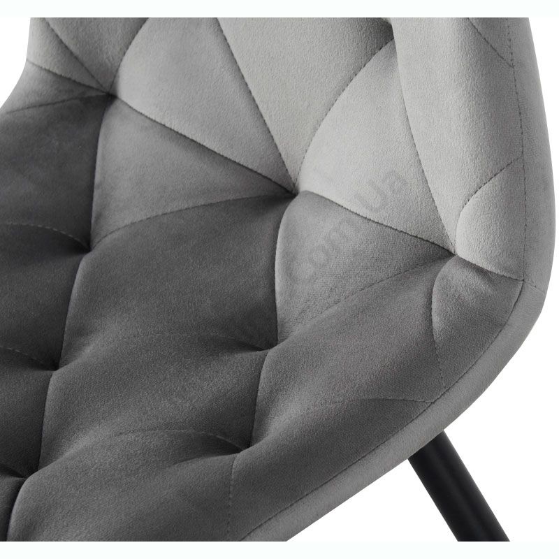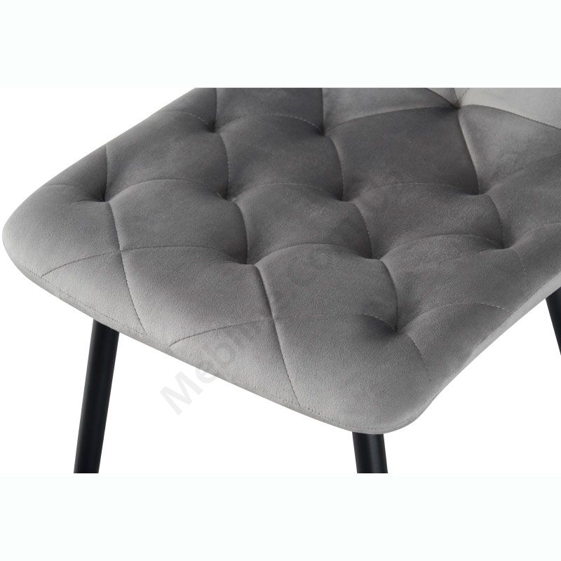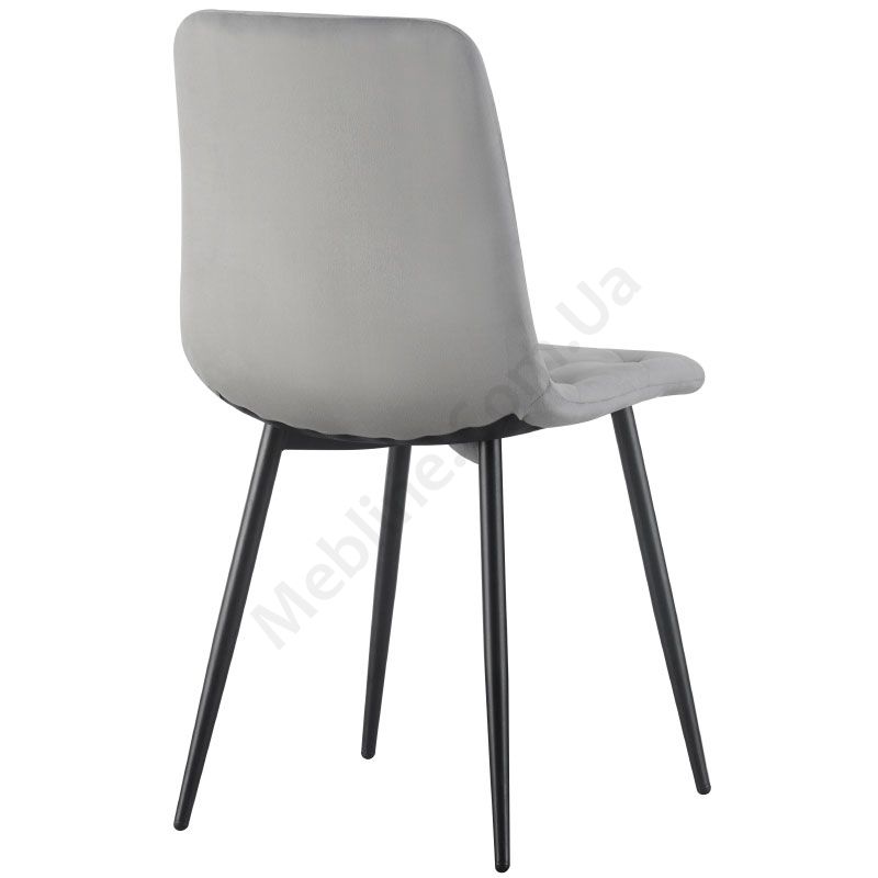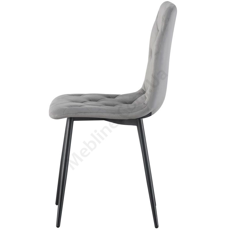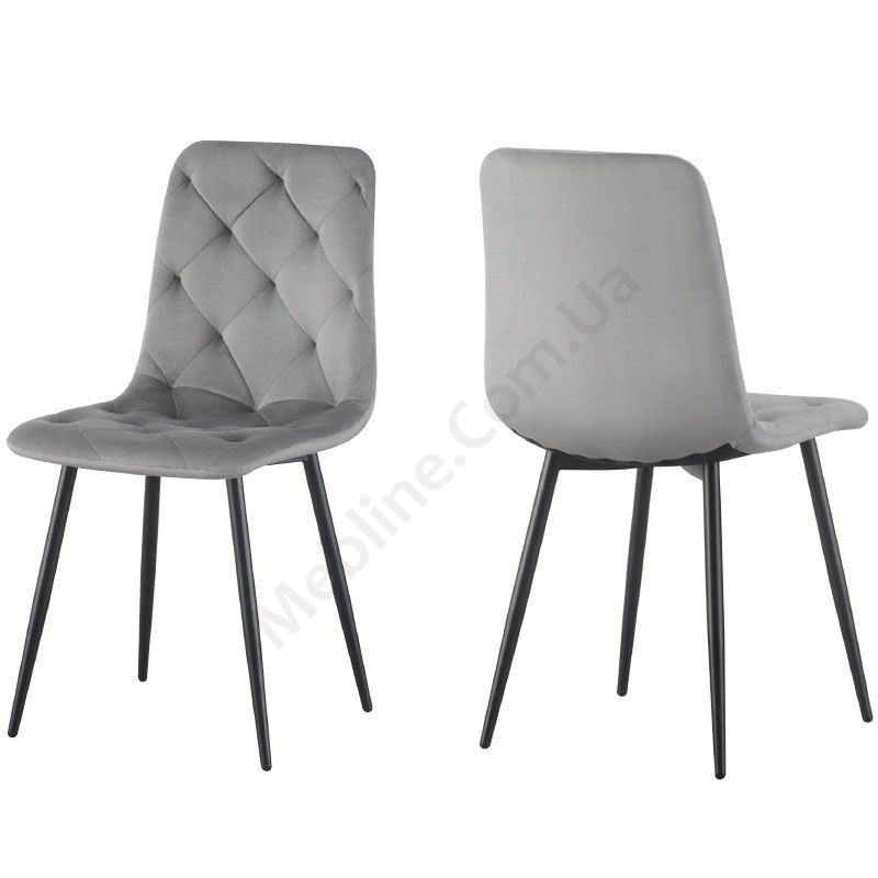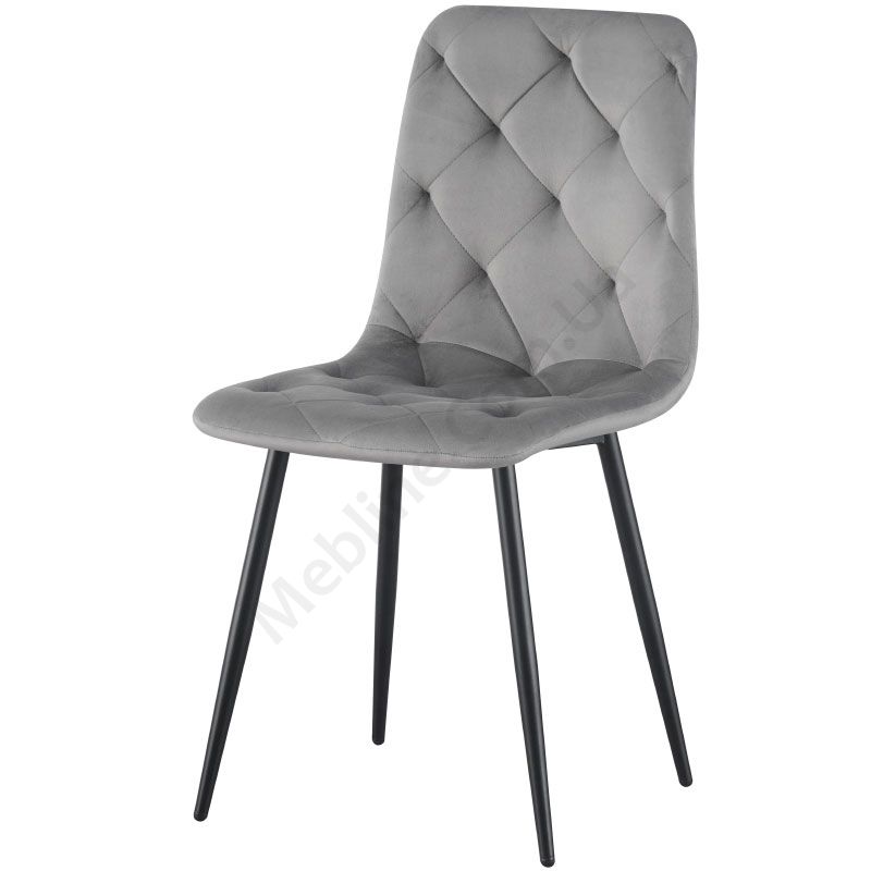 М’який стілець без підлокітників на металевих ніжках з велюровою оббивкою сірого кольору.