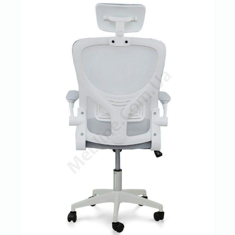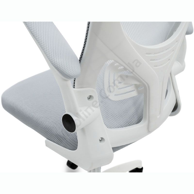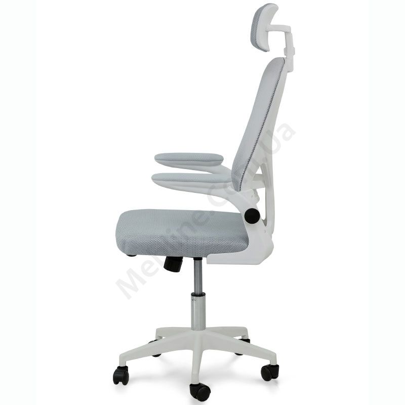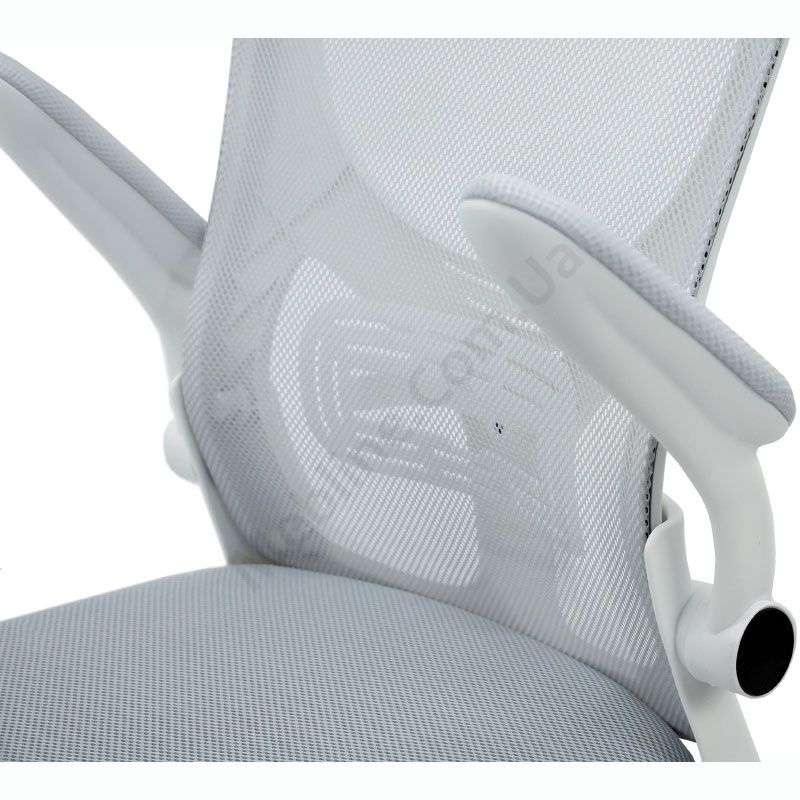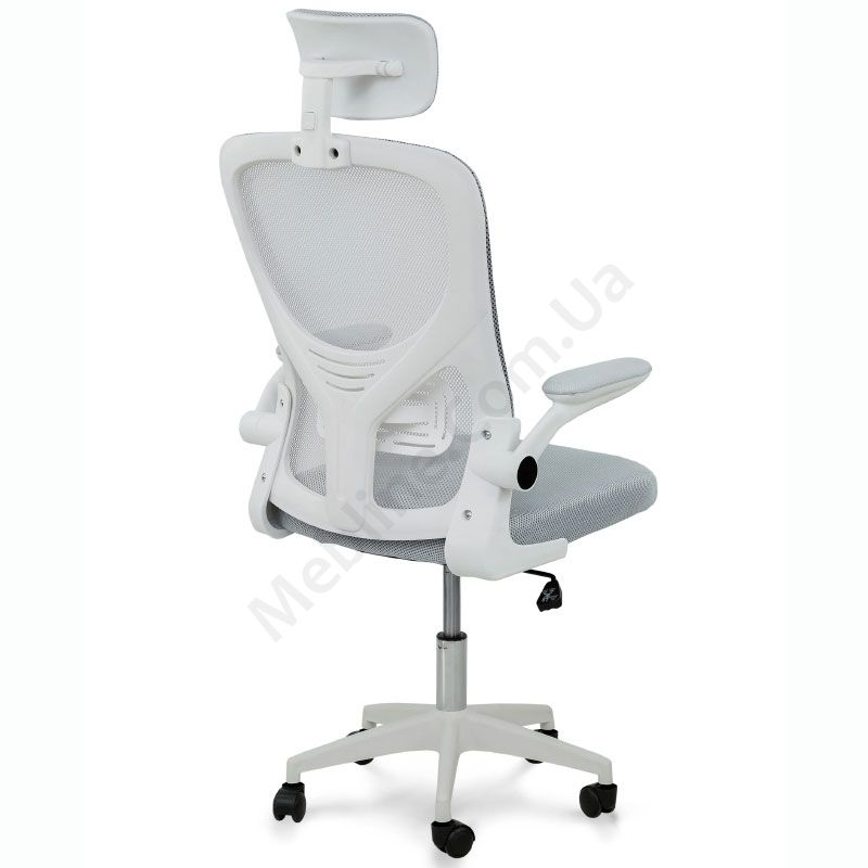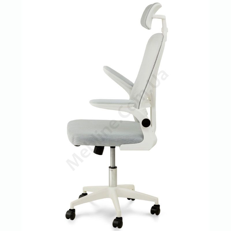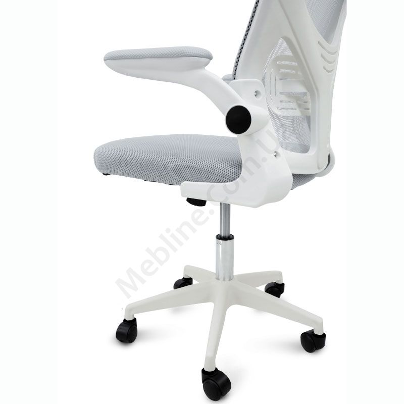 Комп’ютерне крісло на пластиковій хрестовині з сітчастою спинкою та відкидними підлокітниками.