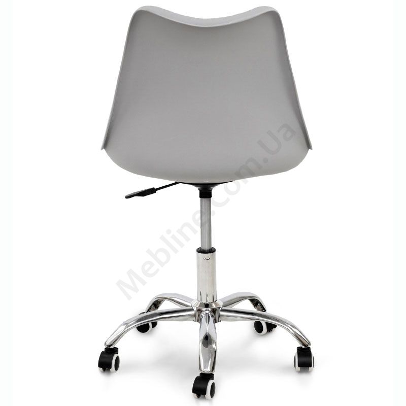 Комп’ютерне крісло на роликах з пластиковою спинкою та м’якою подушкою сидіння.