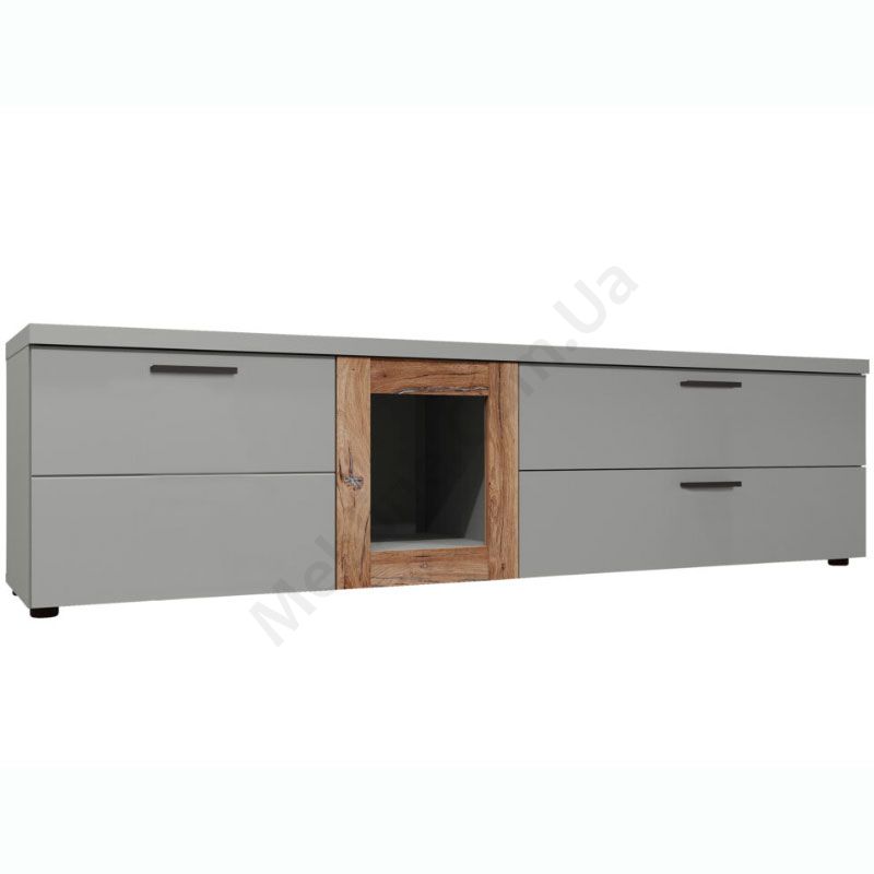Тумба під телевізор з шухлядами, дверцятами та відкритою секцією.
