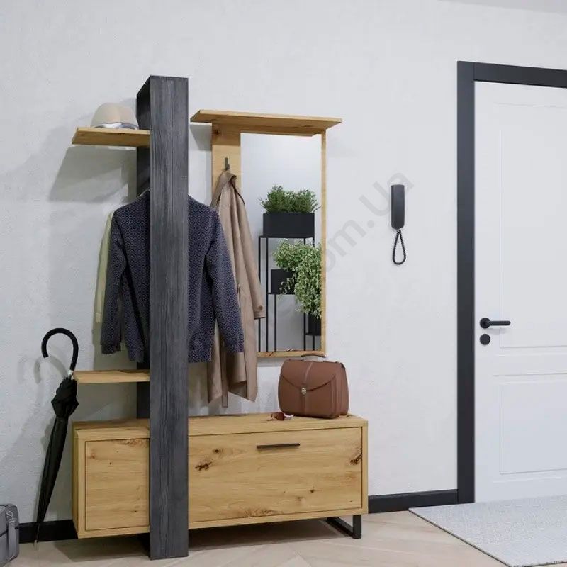 Передпокій з вішаком, дзеркалом та тумбою для взуття.