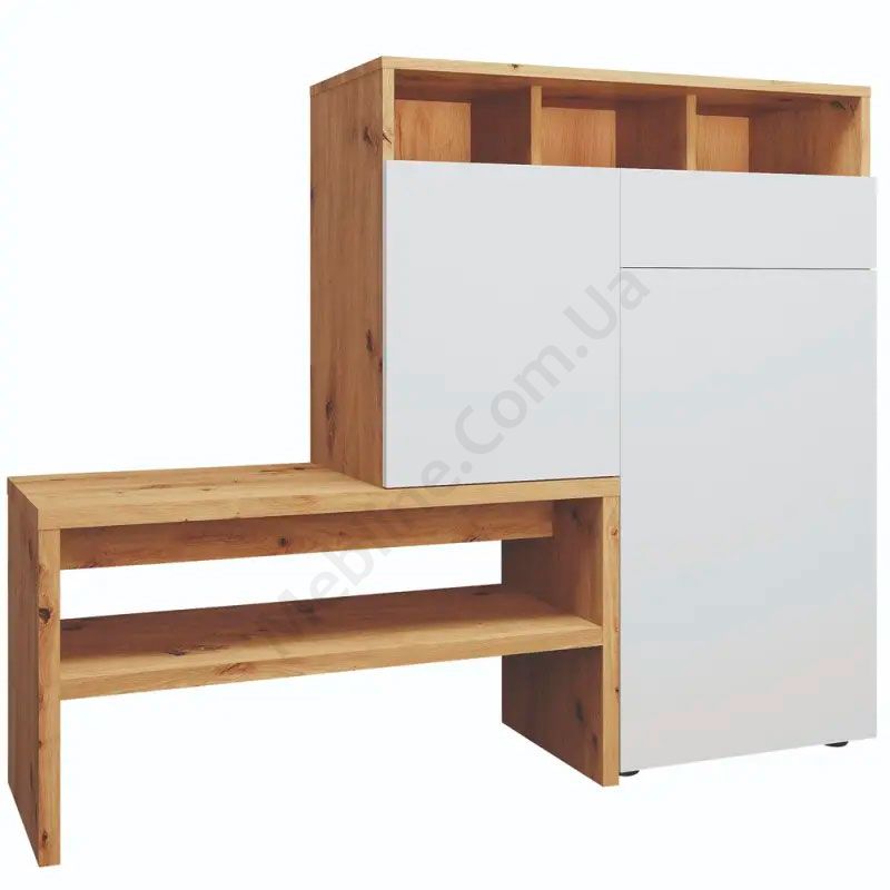 Тумба з лавкою, дверцятами, шухлядою та відкритими полицями.