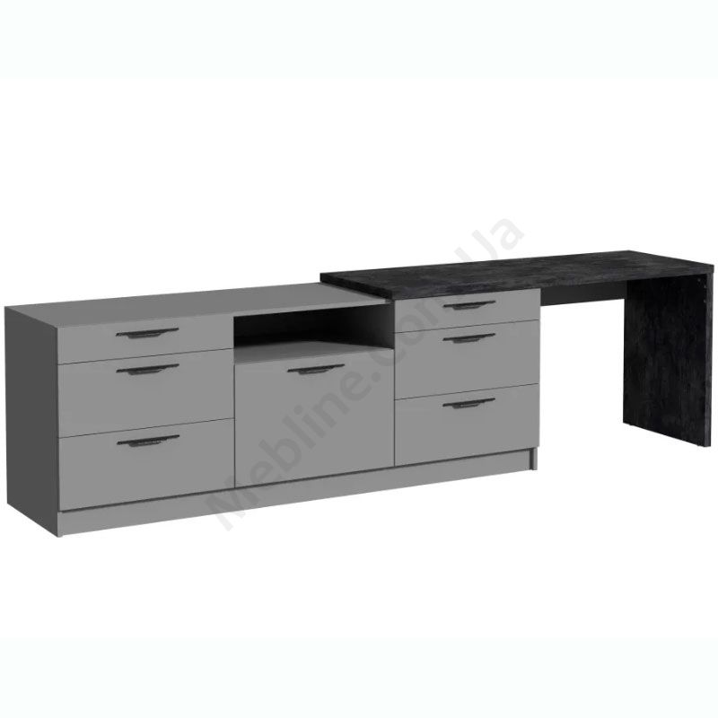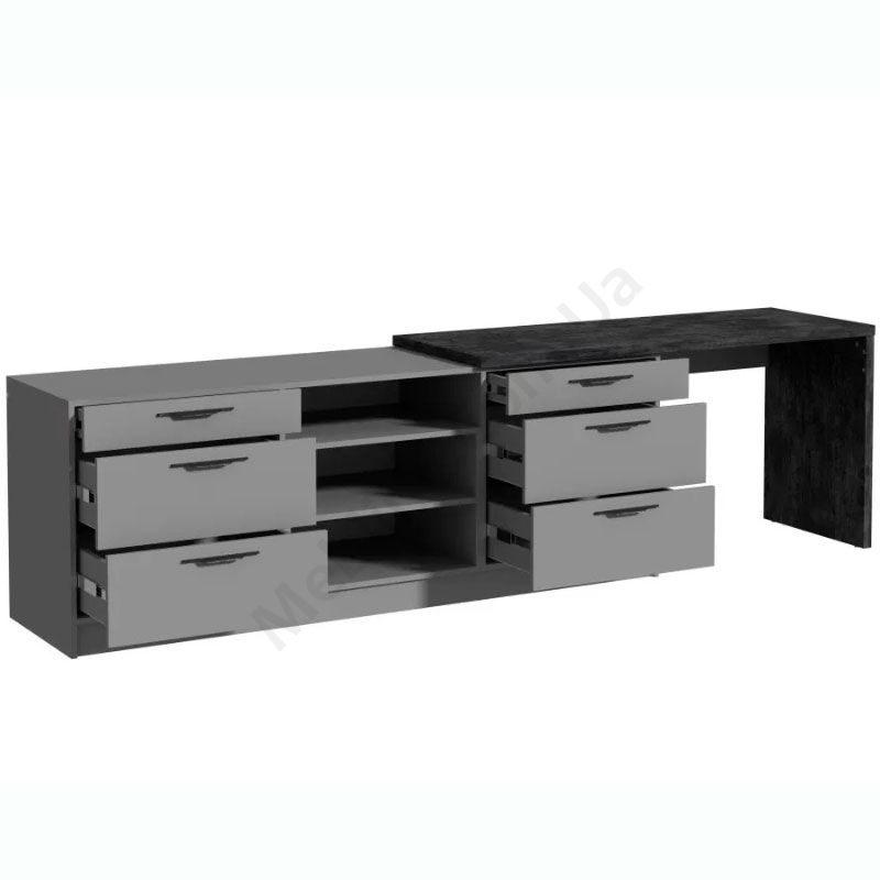 Тумба під телевізор з висувними шухлядами, дверцятами та полицею.