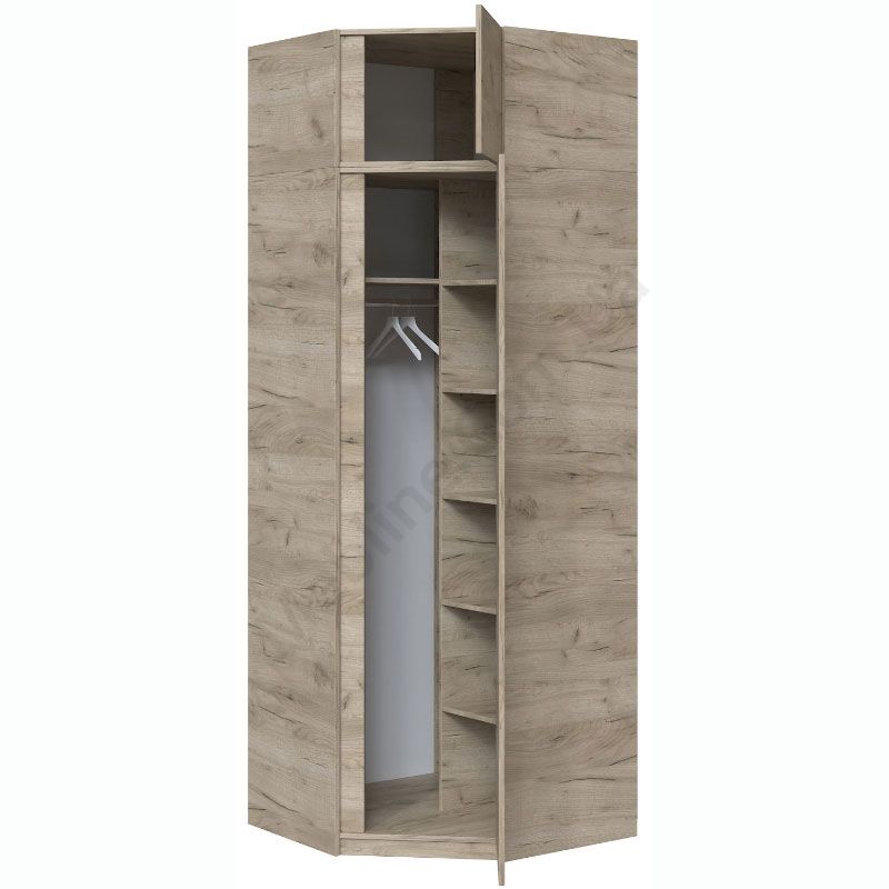 Однодверна кутова шафа зі штангою для одягу та полицями.