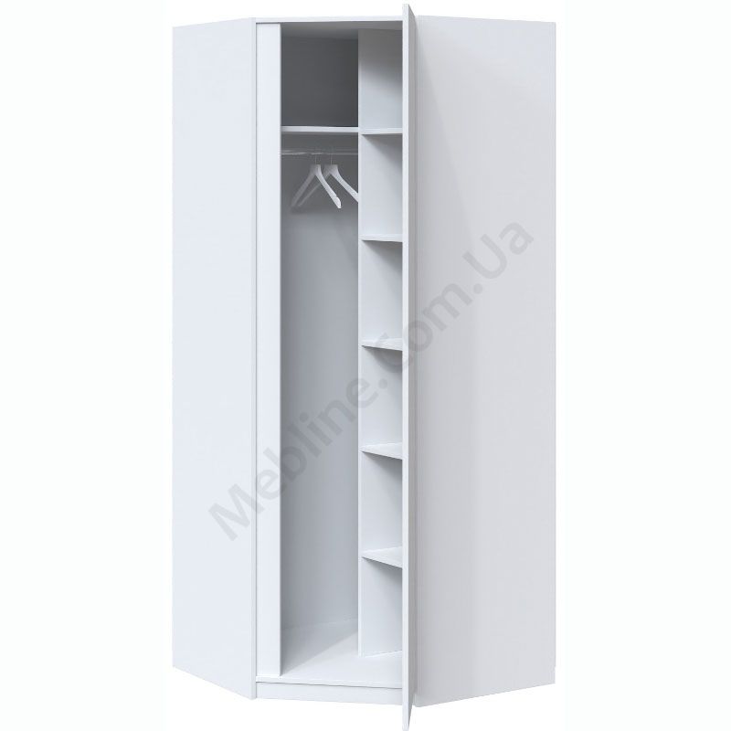 Однодверна кутова шафа зі штангою для одягу та полицями.