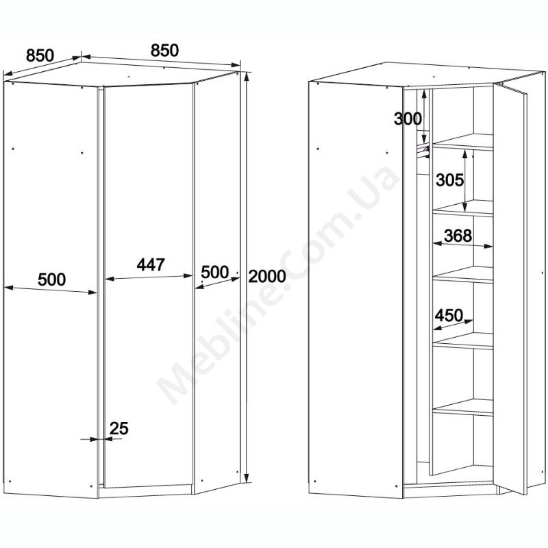 Однодверна кутова шафа зі штангою для одягу та полицями.