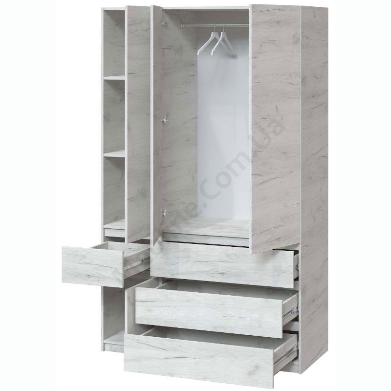 Тристулкова шафа з висувними шухлядами, штангою та полицями всередині.
