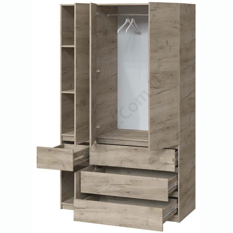 Тристулкова шафа з висувними шухлядами, штангою та полицями всередині.