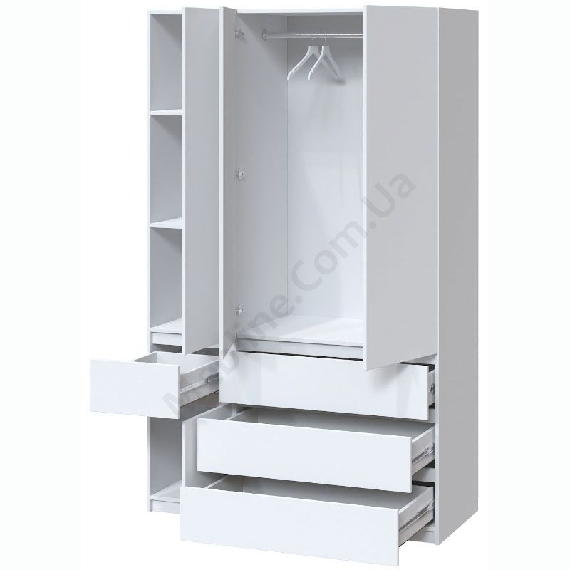 Тристулкова шафа з висувними шухлядами, штангою та полицями всередині.
