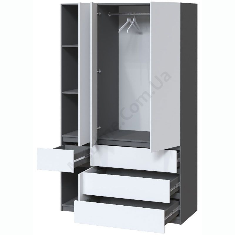Тристулкова шафа з висувними шухлядами, штангою та полицями всередині.