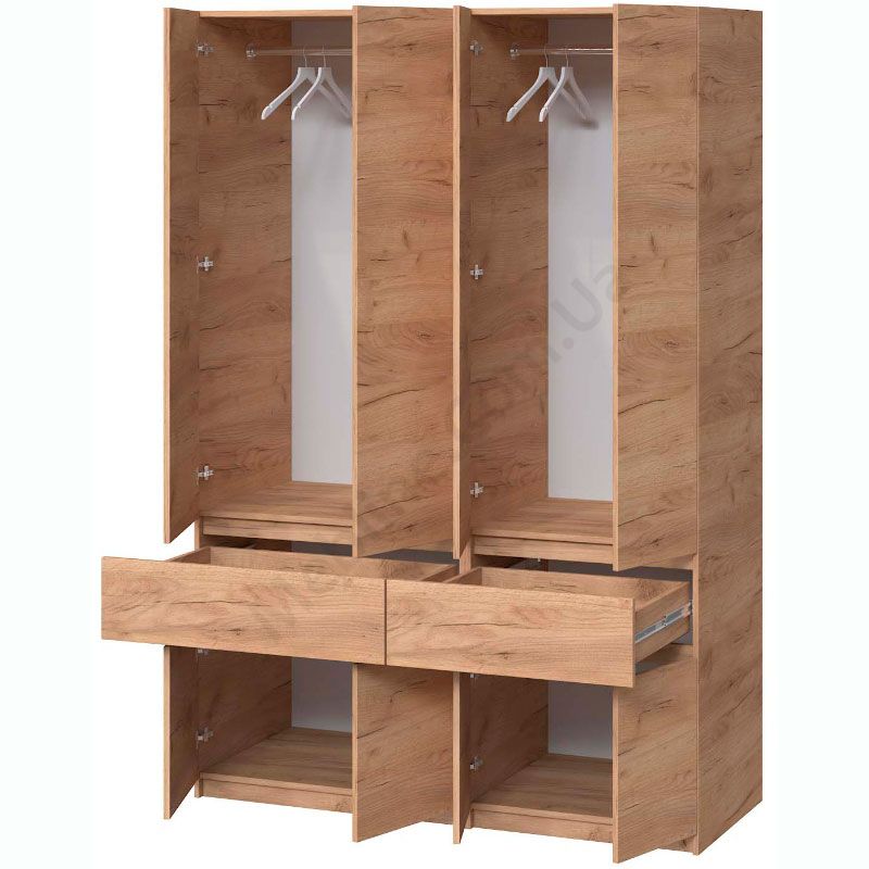 Чотиристулкова шафа з висувними шухлядами та штангами для одягу.