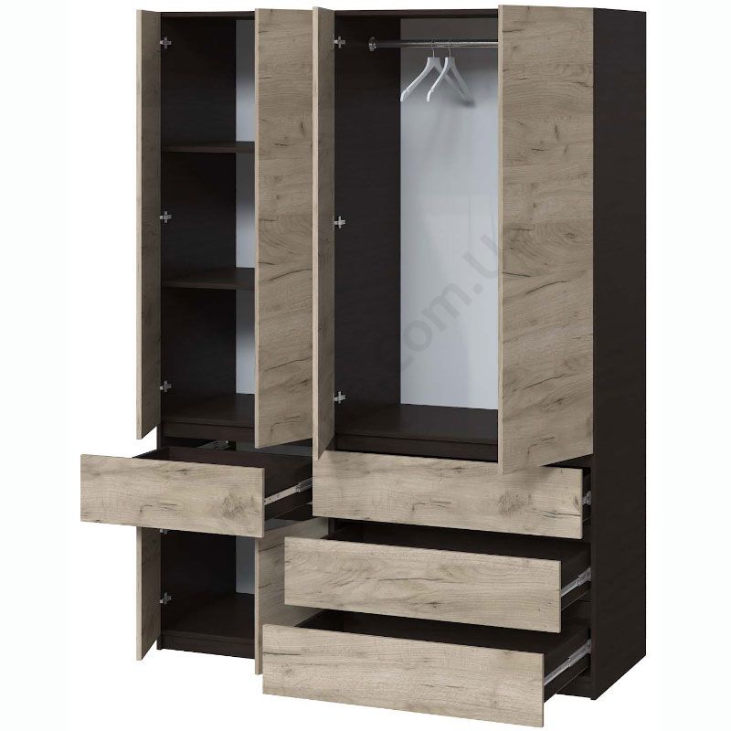 Чотиристулкова шафа з висувними шухлядами, штангою та полицями.