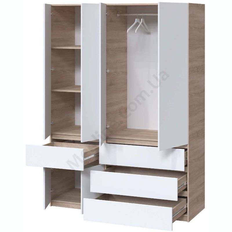 Чотиристулкова шафа з висувними шухлядами, штангою та полицями.