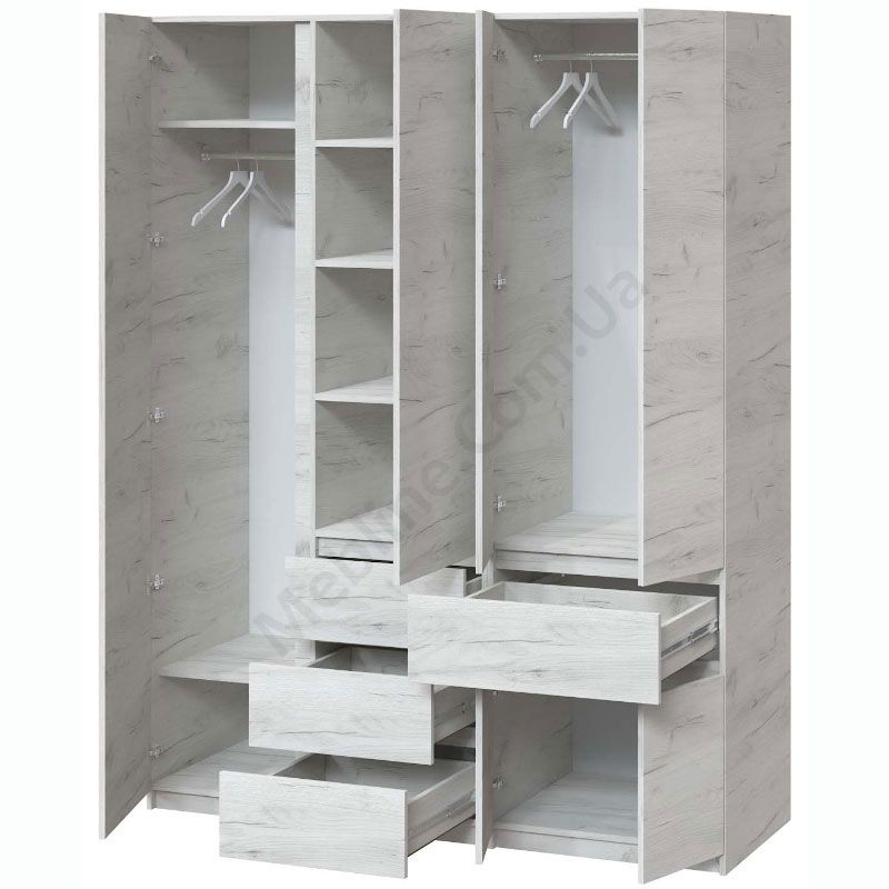 Чотиристулкова шафа з висувними шухлядами, штангами для одягу та полицями.