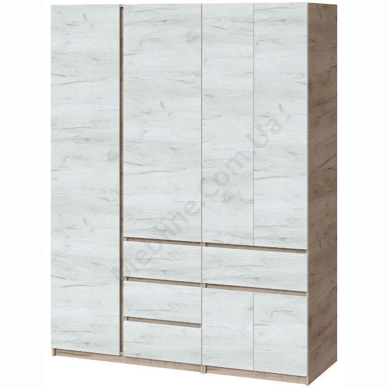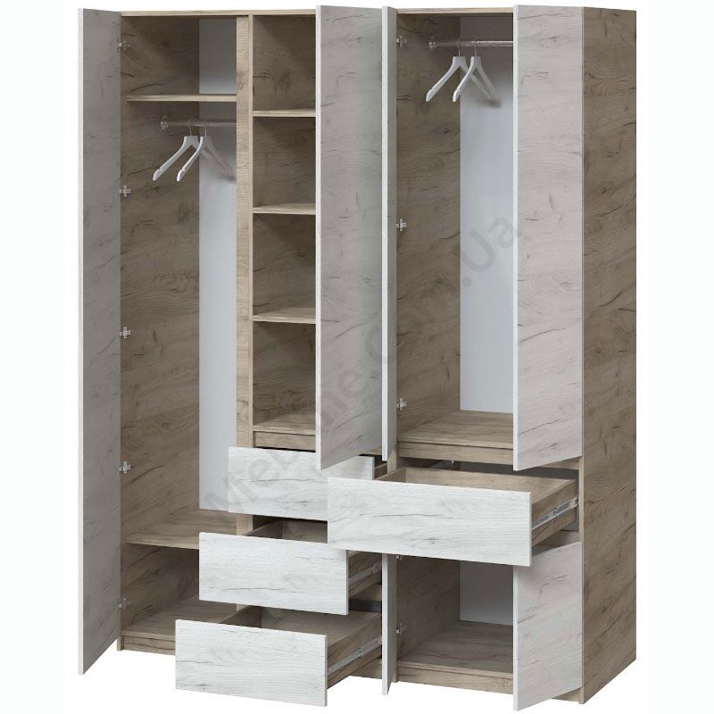 Чотиристулкова шафа з висувними шухлядами, штангами для одягу та полицями.