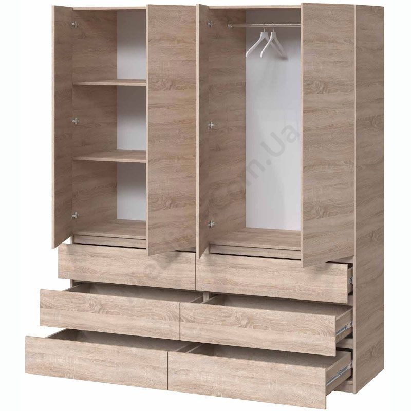 Чотиристулкова шафа з висувними шухлядами, штангою для одягу та полицями.