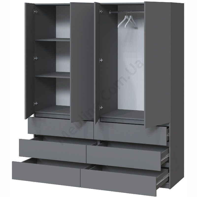 Чотиристулкова шафа з висувними шухлядами, штангою для одягу та полицями.