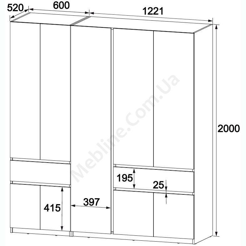 - За чотирма верхніми дверцятами дві штанги для одягу.