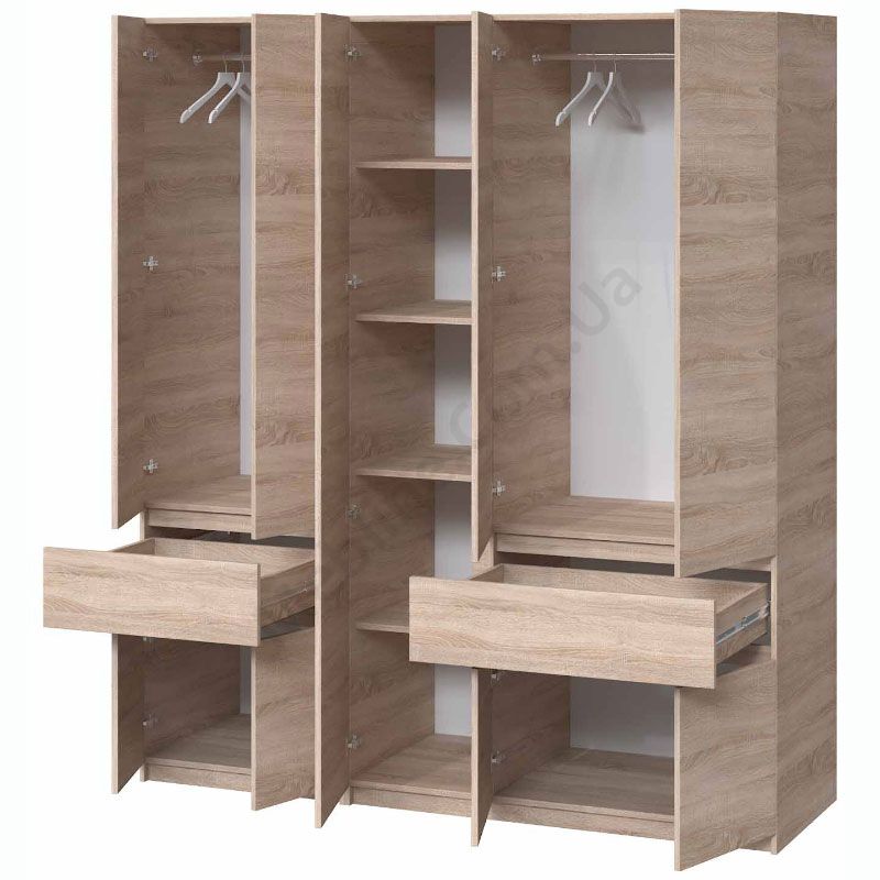 П’ятистулкова шафа з висувними шухлядами, штангами для одягу та полицями.