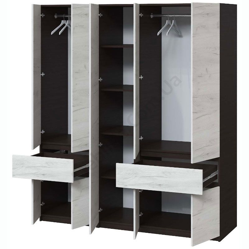 П’ятистулкова шафа з висувними шухлядами, штангами для одягу та полицями.