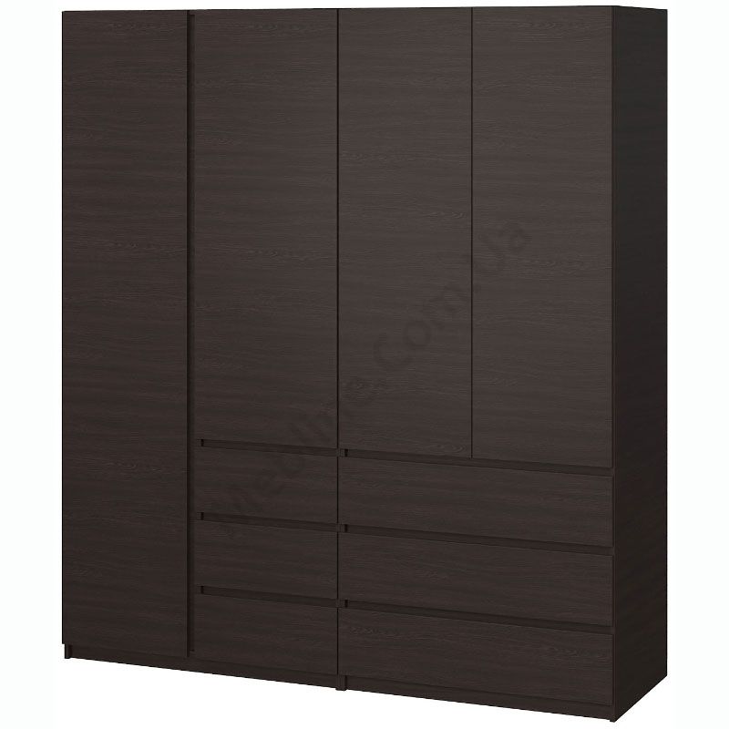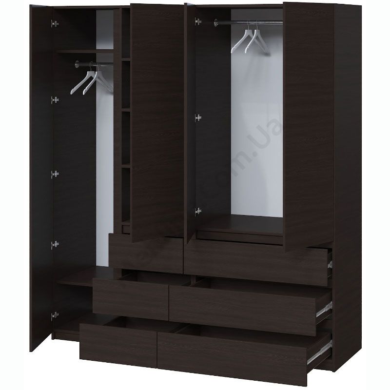 Чотиристулкова шафа з висувними шухлядами, штангами для одягу та полицями.