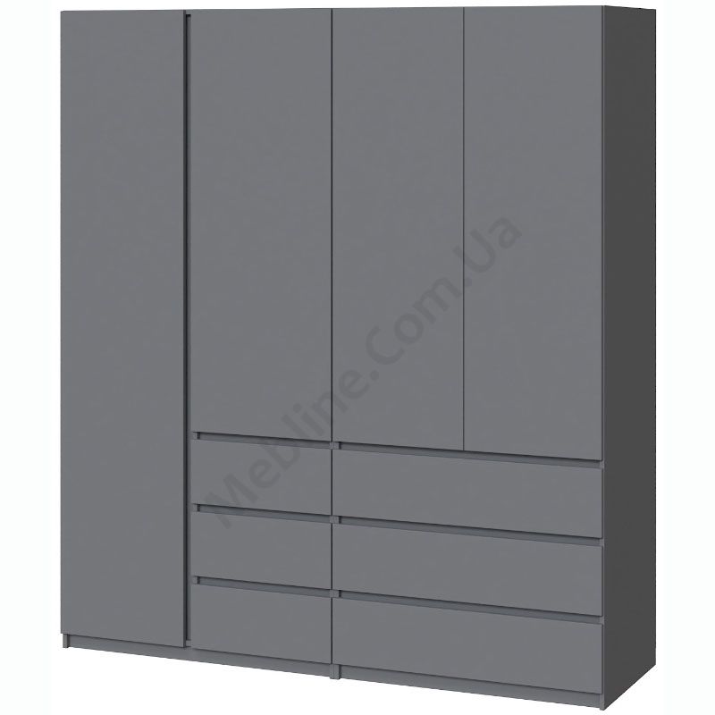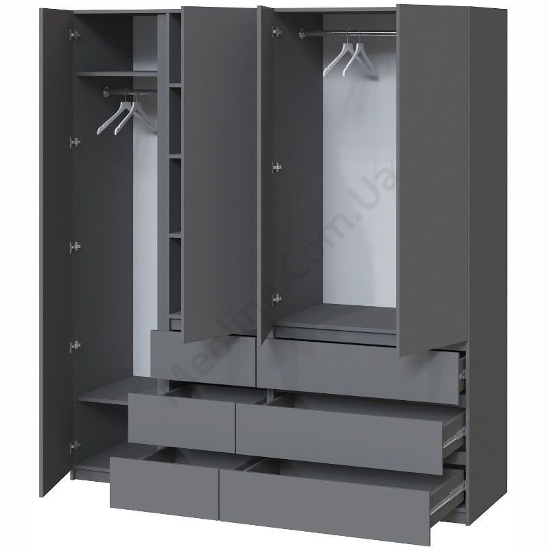 Чотиристулкова шафа з висувними шухлядами, штангами для одягу та полицями.