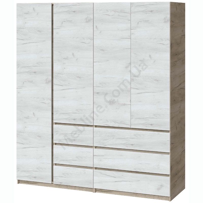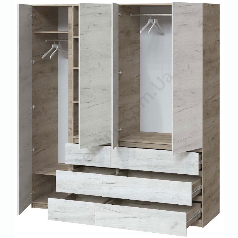 Чотиристулкова шафа з висувними шухлядами, штангами для одягу та полицями.