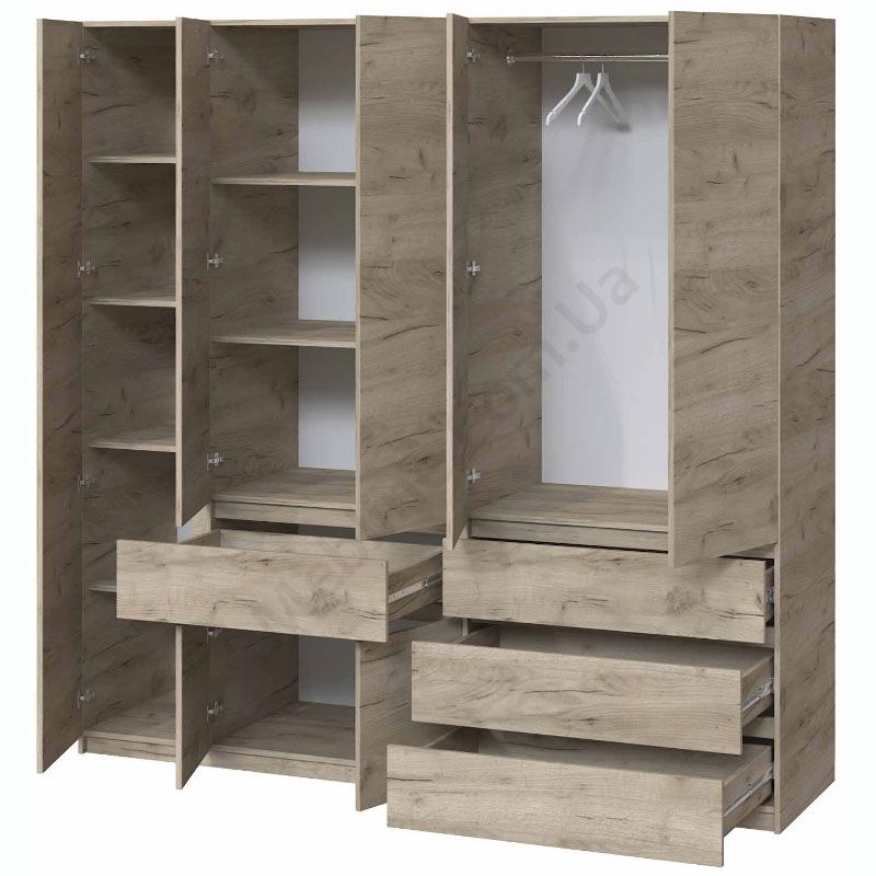 П’ятистулкова шафа з висувними шухлядами, штангами та полицями.