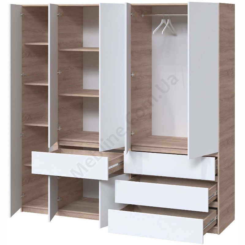П’ятистулкова шафа з висувними шухлядами, штангами та полицями.