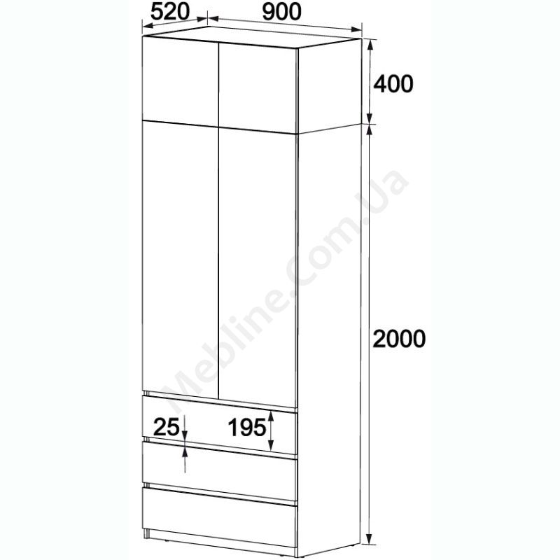 Двостулкова шафа з висувними шухлядами, антресоллю та штангою всередині.