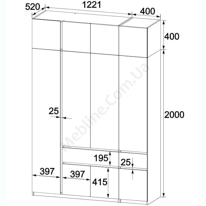 Чотиристулкова шафа з висувними шухлядами та антресоллю.