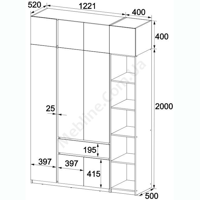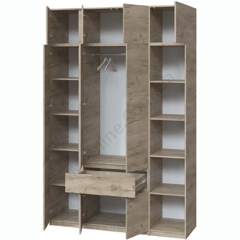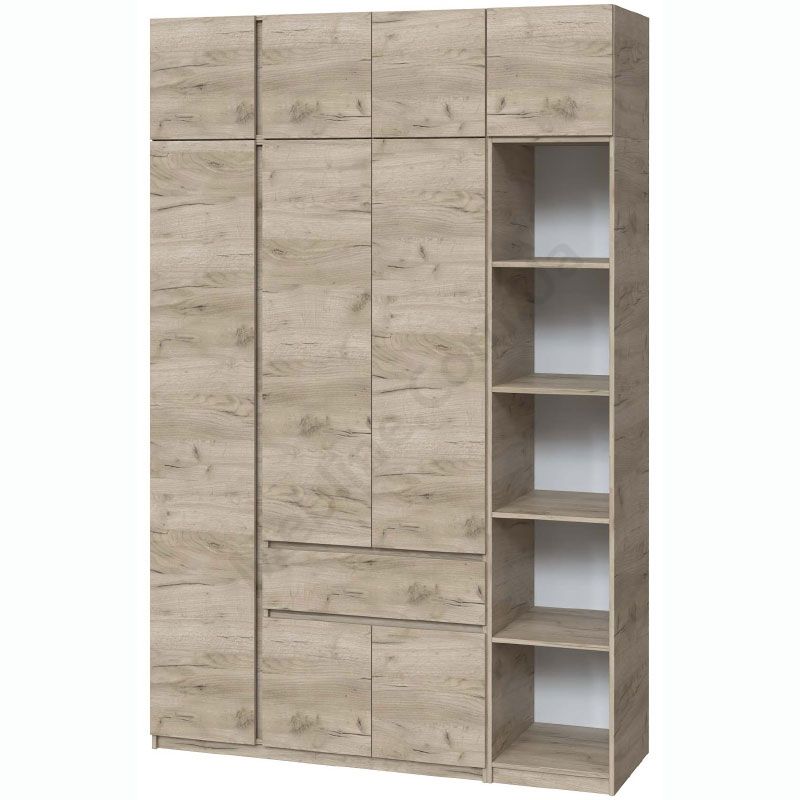 Чотиристулкова шафа з висувними шухлядами, антресоллю та відкритими полицями.