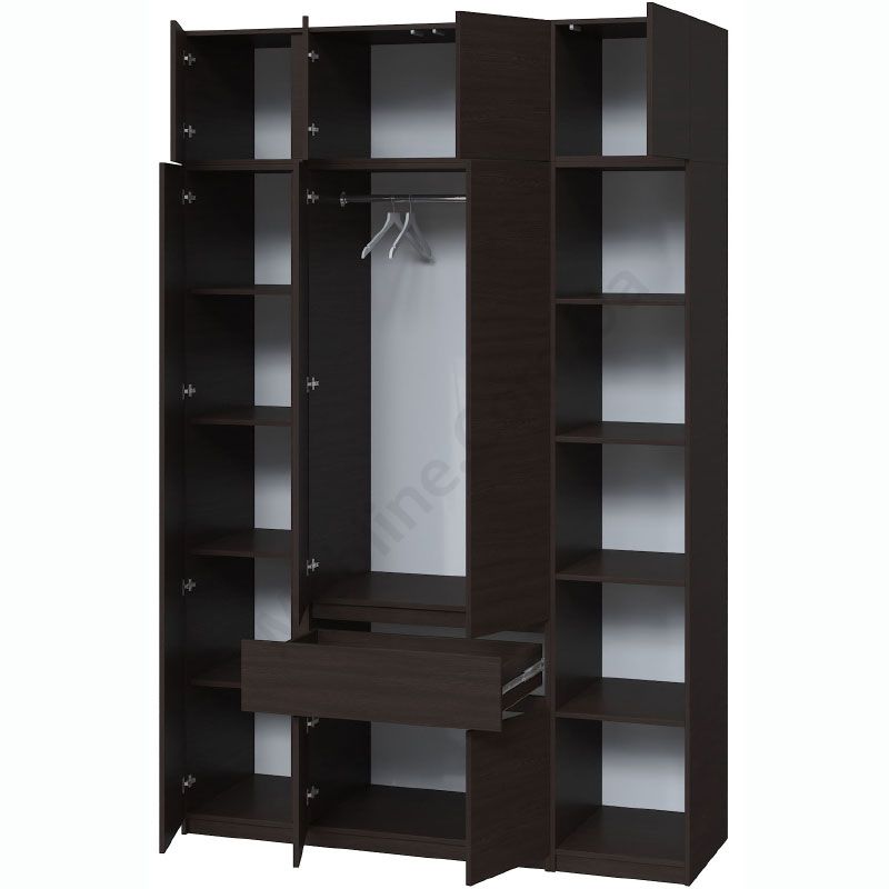 Чотиристулкова шафа з висувними шухлядами, антресоллю та відкритими полицями.