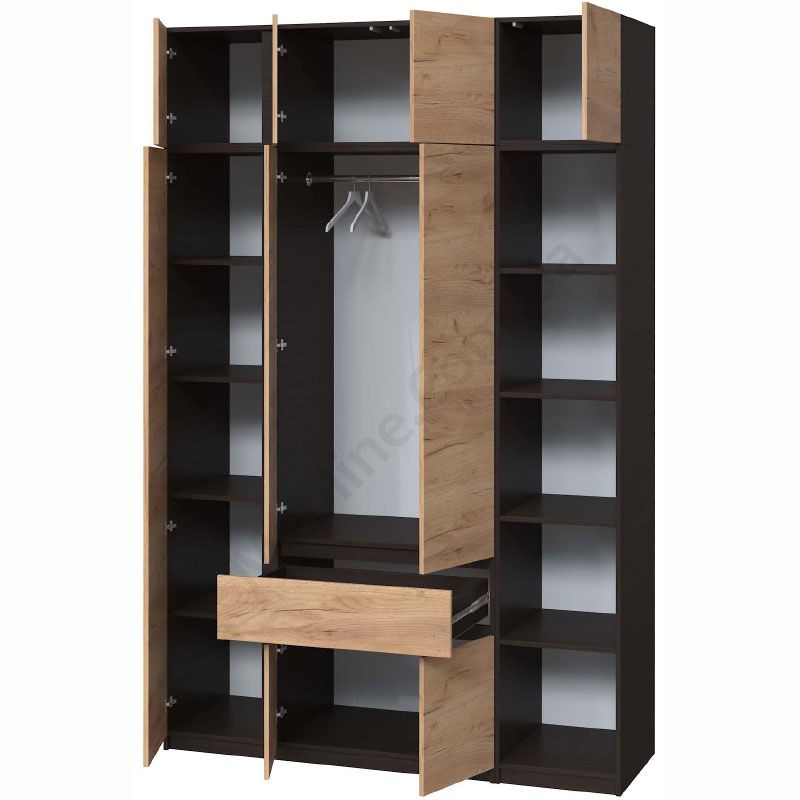 Чотиристулкова шафа з висувними шухлядами, антресоллю та відкритими полицями.