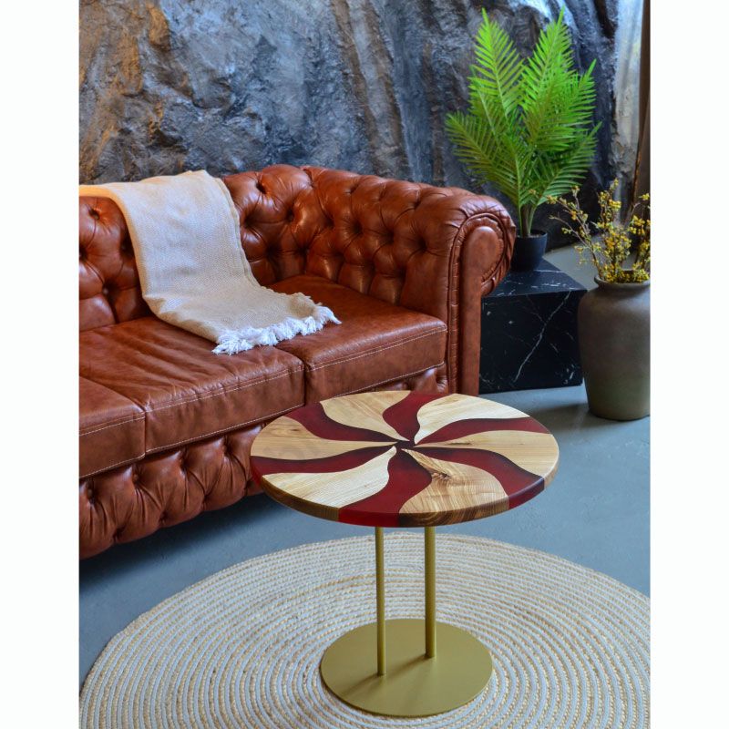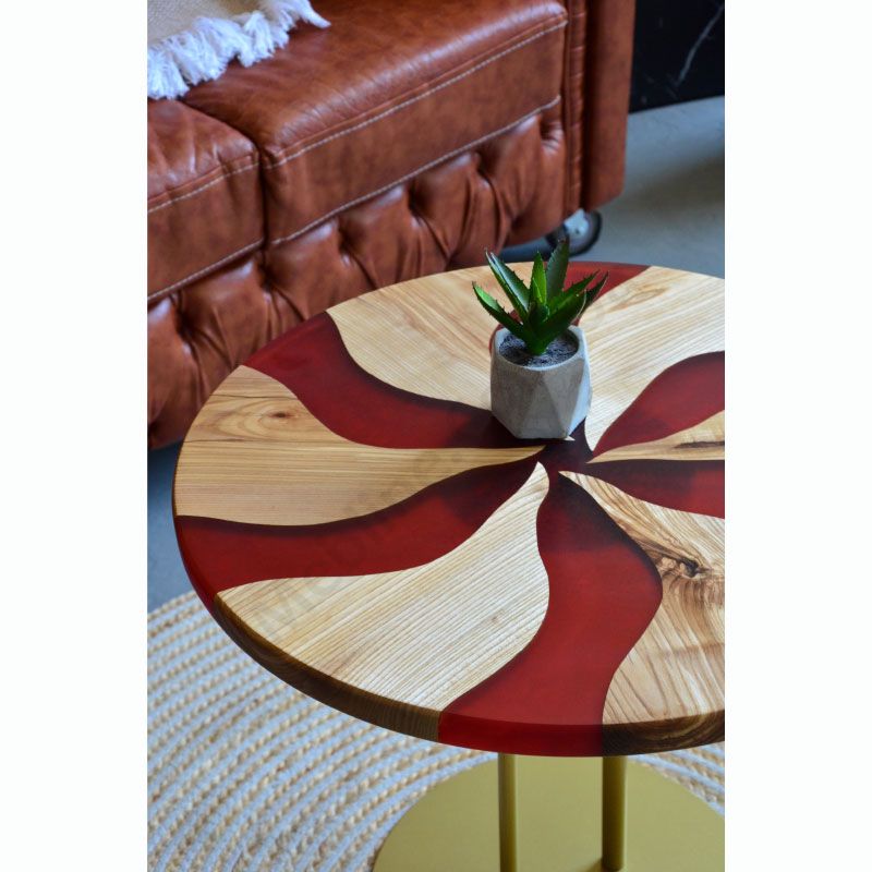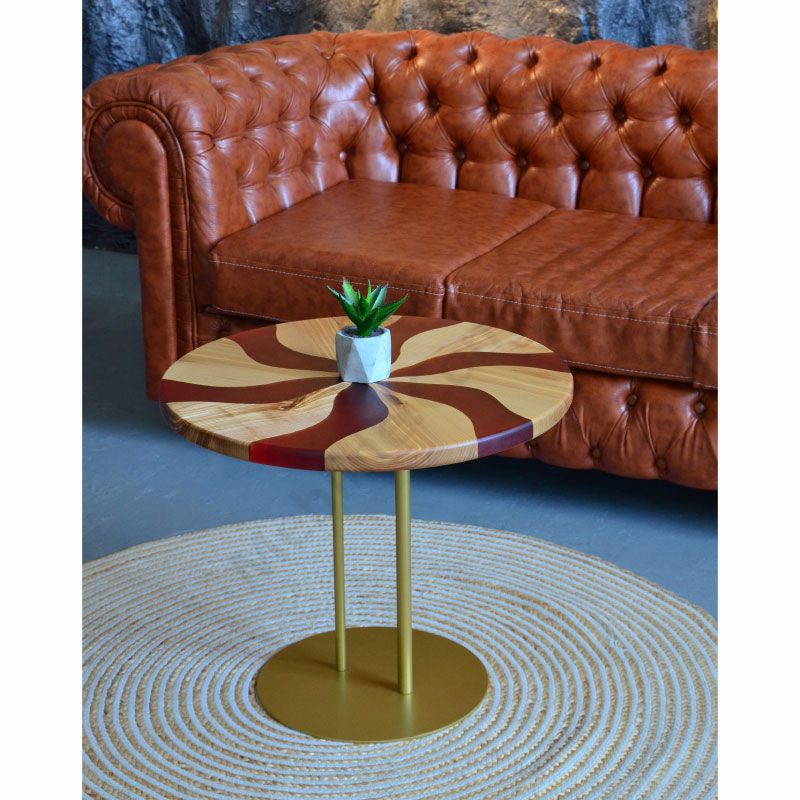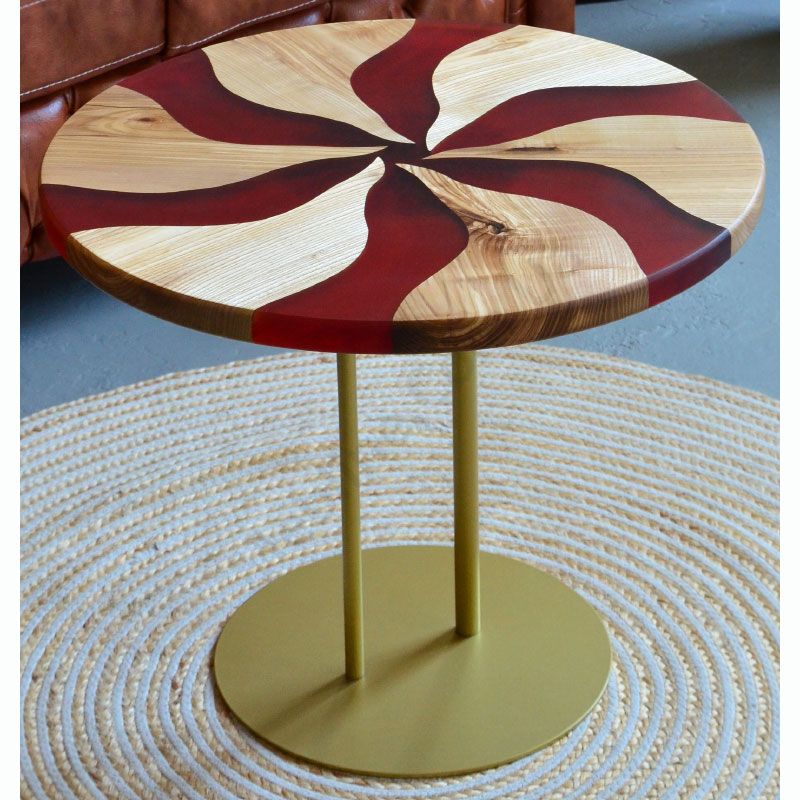 Круглий журнальний стіл з дерева та епоксидної смоли на металевій основі.