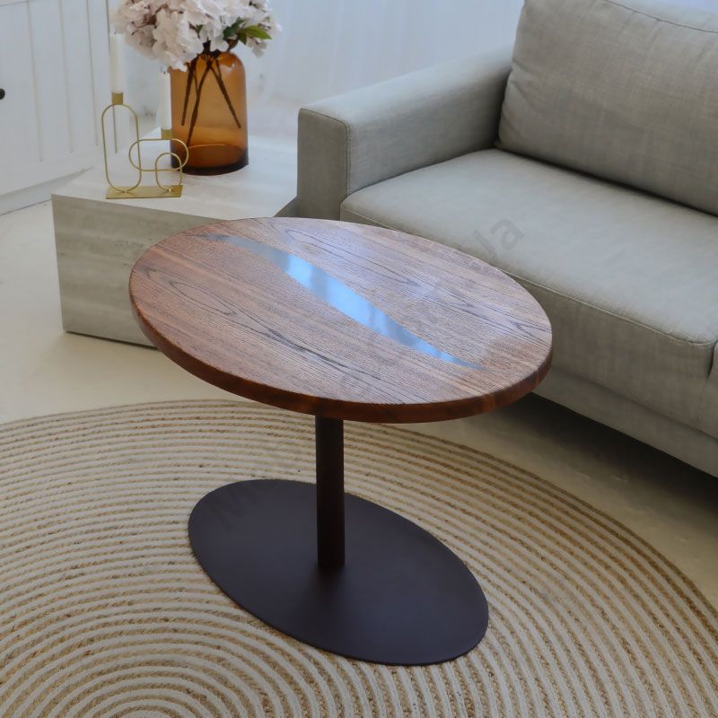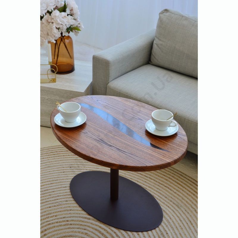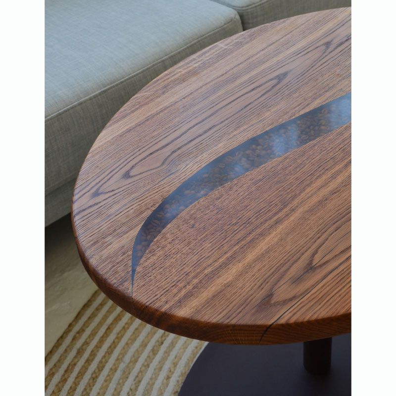 Овальний дерев’яний стіл з епоксидною смолою та зернами кави на металевій основі.