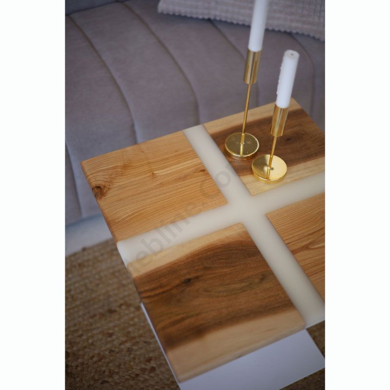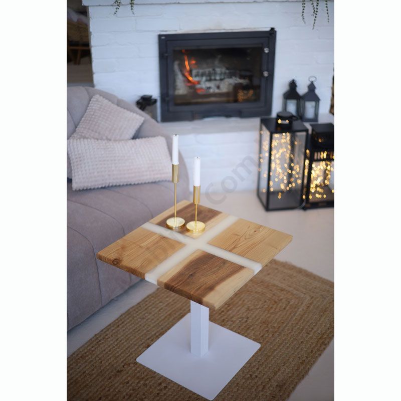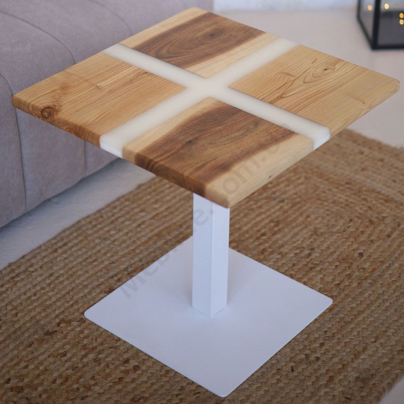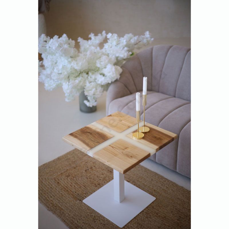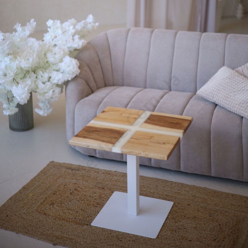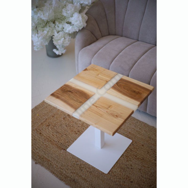 Квадратний дерев’яний стіл з епоксидною смолою на металевій основі.
