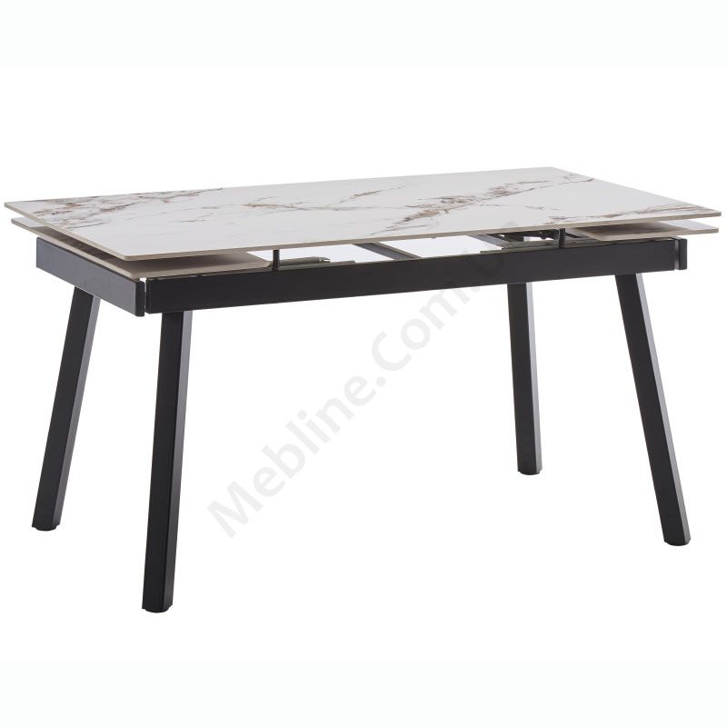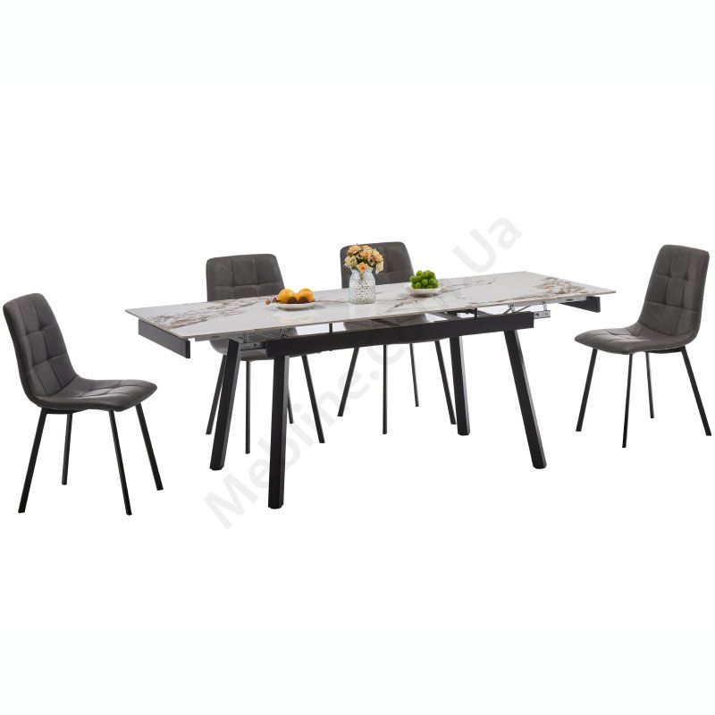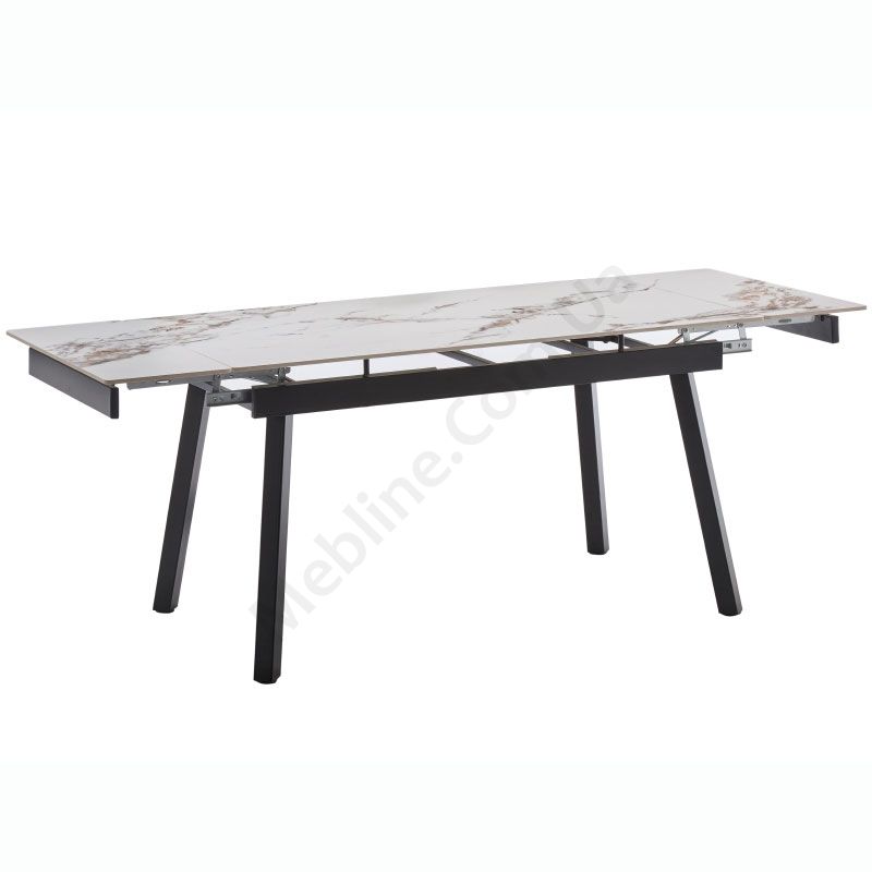 Розкладний обідній стіл на металевих ніжках з керамічною стільницею.