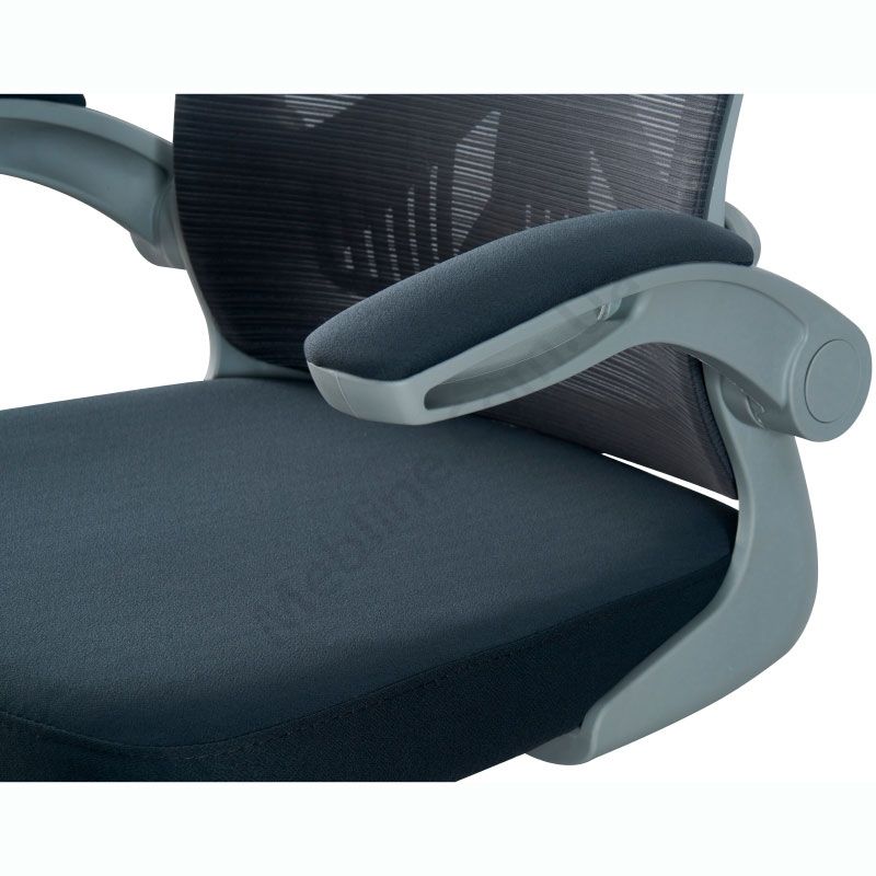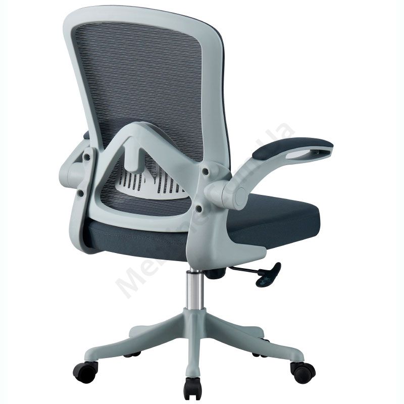 Комп’ютерне крісло на пластиковій хрестовині з сітчастою спинкою та підлокітниками.