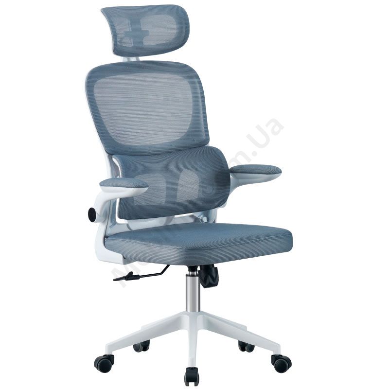 Комп’ютерне крісло на пластиковій хрестовині з сітчастою спинкою та підлокітниками.