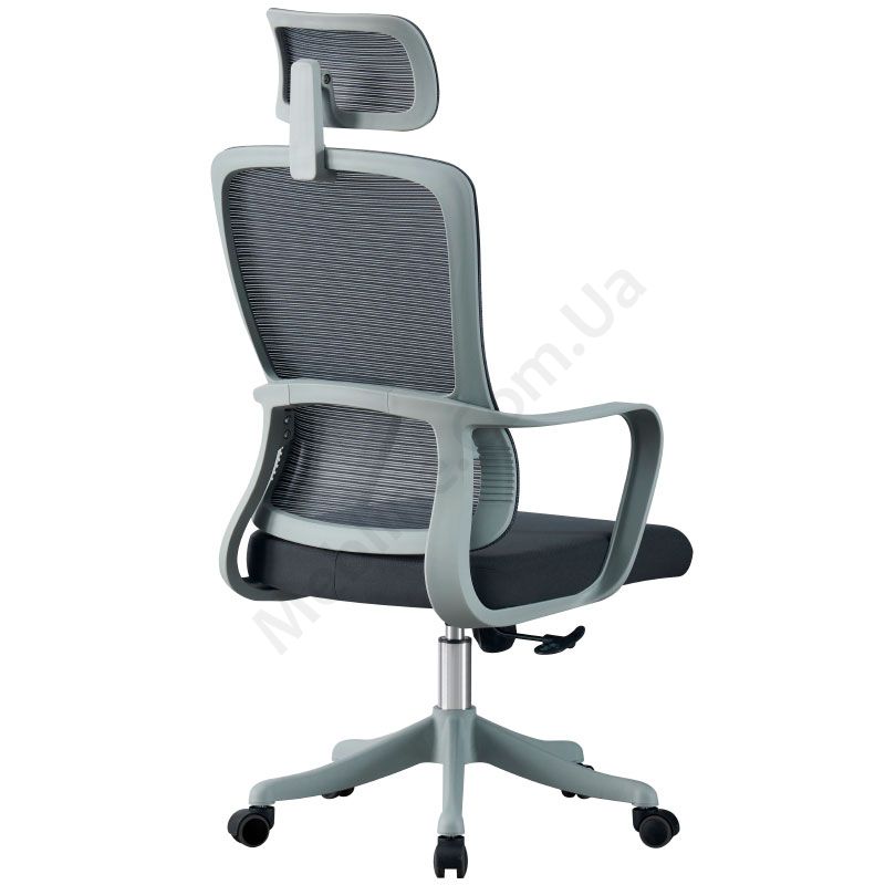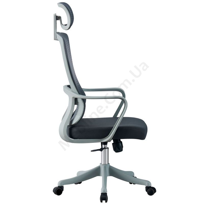 Комп’ютерне крісло на металевій хрестовині з сітчастою спинкою та підголівником.