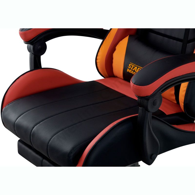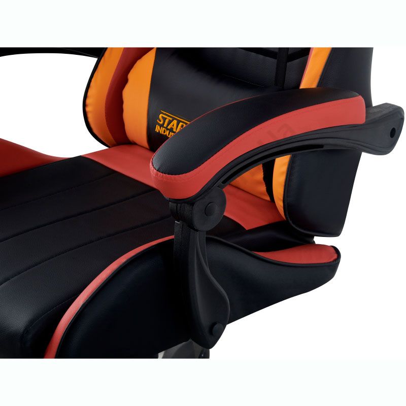 - Оббивка зі штучної шкіри у комбінації чорного, червоного та помаранчевого кольорів.